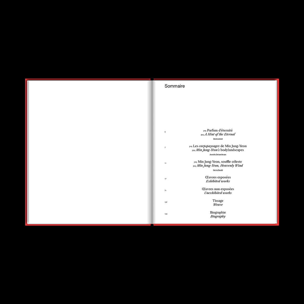 Exhibition catalogue designed for Min Jung-Yeon's solo show at Suquet Des Artistes in Cannes. Foreword by Hanna Baudet, published by Bernard Chauveau éditions.