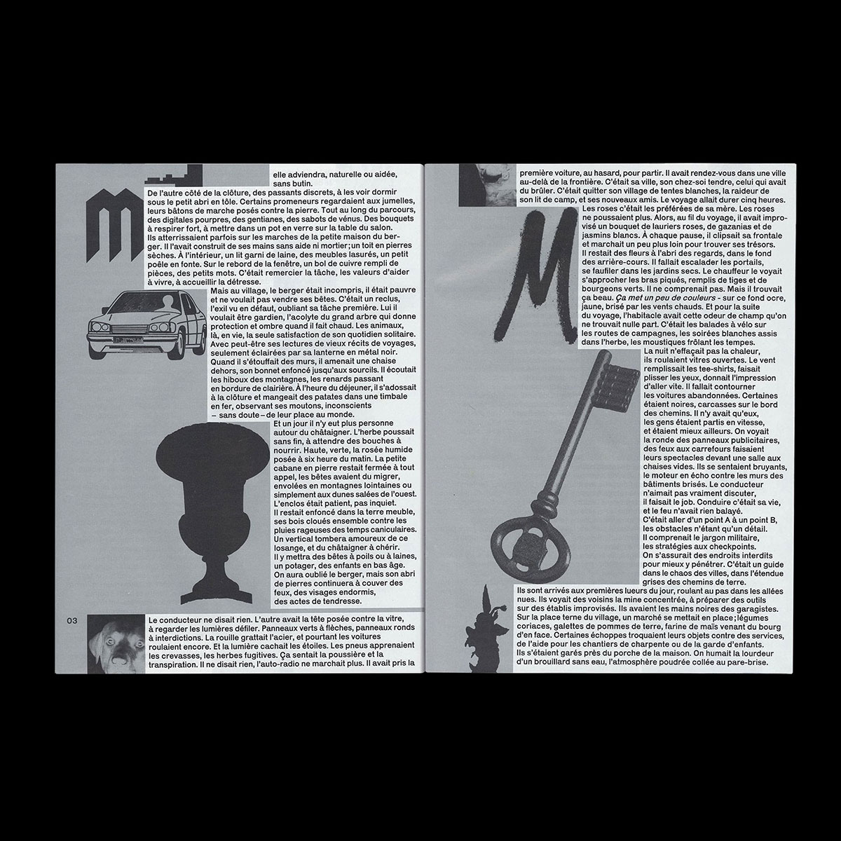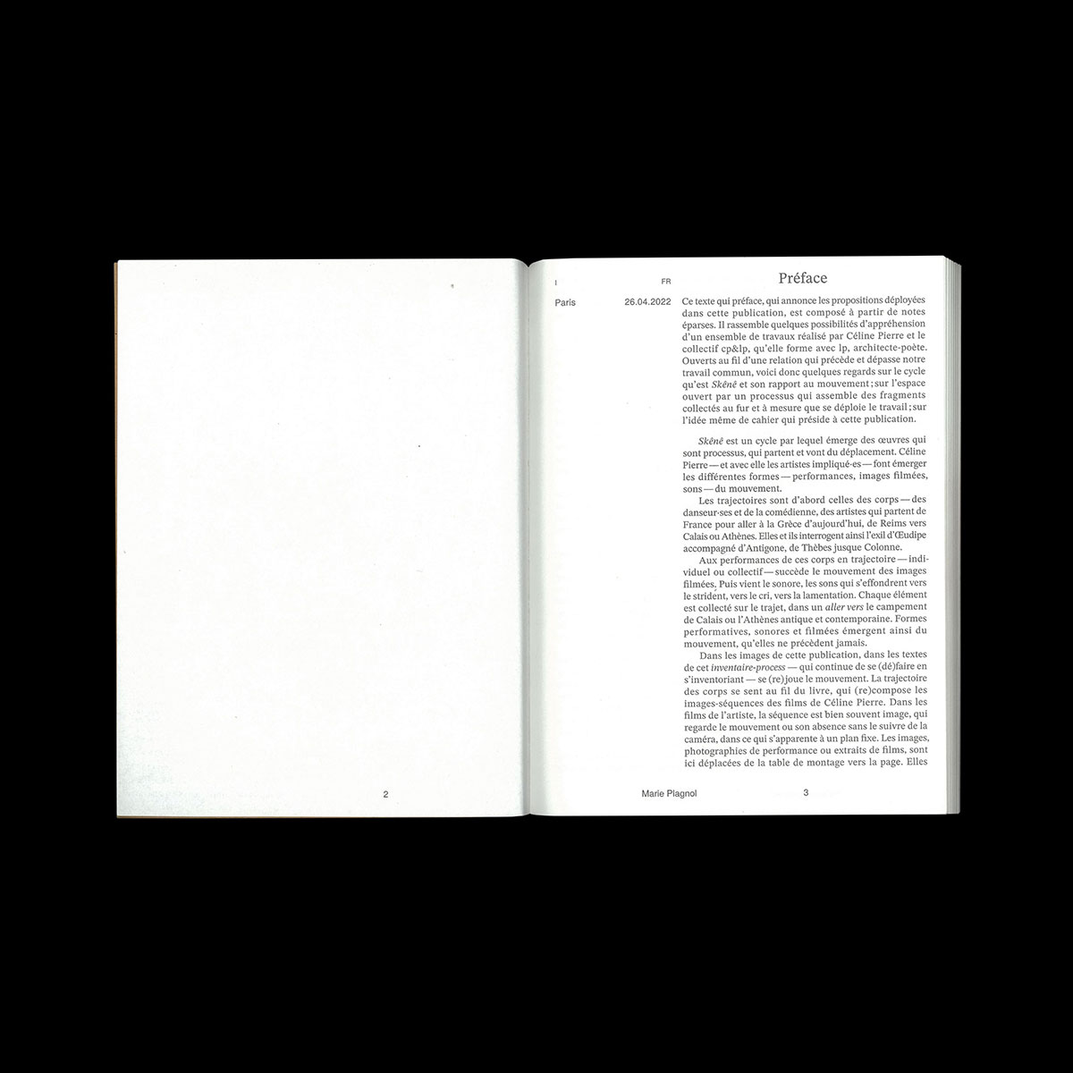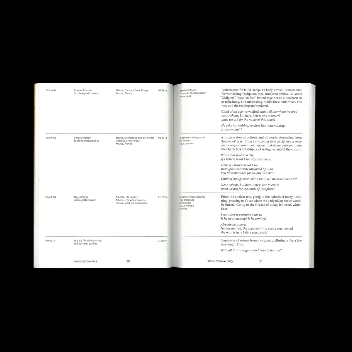Monograph publication designed by Rémi Levaufre and I as Atelier Magabi, for Céline Pierre's work cycle Skênê. Various editorial matters (poetry, photographs, journal entries, etc) come together as an always changing body colliding with itself. Foreword by Marie Plagnol. Published by Les Septantes des écritures multiples