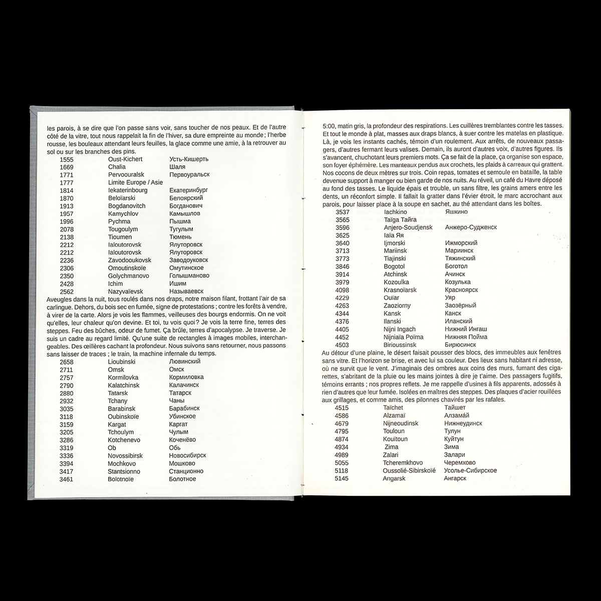 Book design for a self published photographic project telling the tale of a train trip through Siberia. A phone, taped to the window of the transsiberian train is programmed to take a photo every few minutes. 700 images make it into this book, a systematic attempt to sample Russia's landscape. Foreword by Sam Diaz.